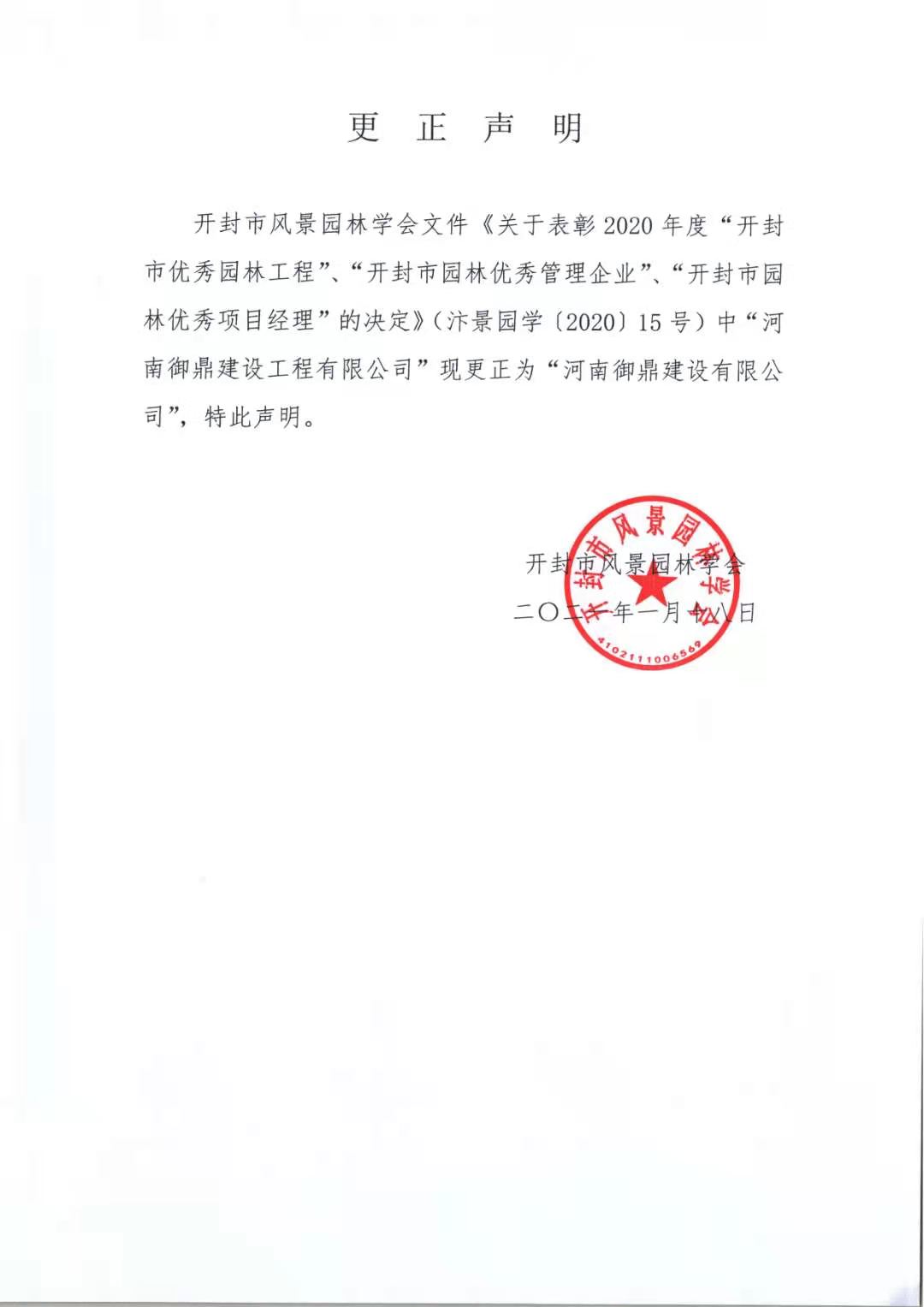 关于表彰2020年度“开封市园林优秀管理企业”更正声明